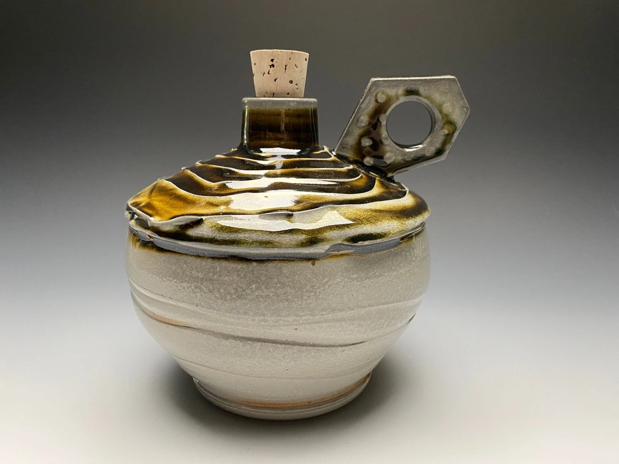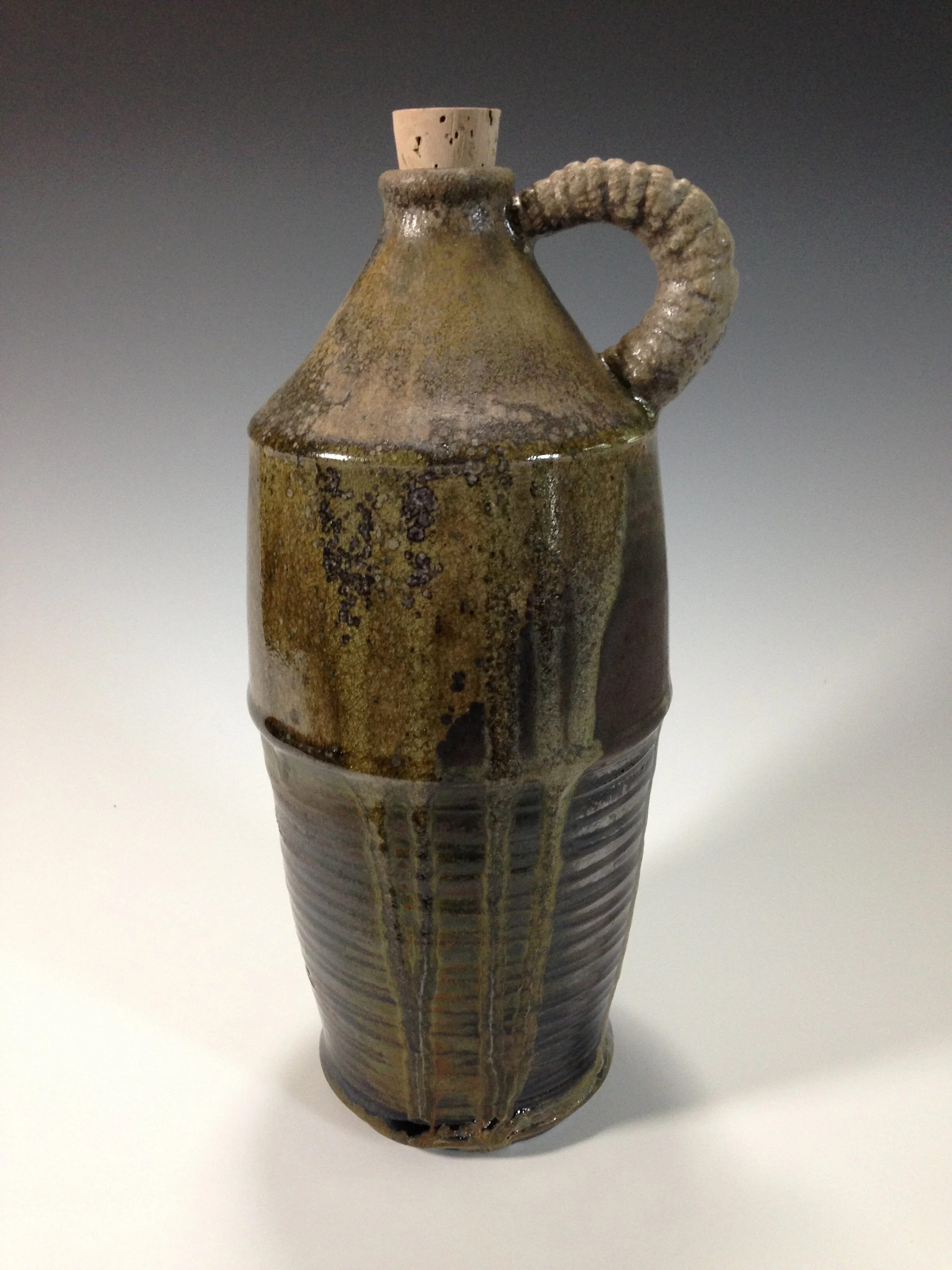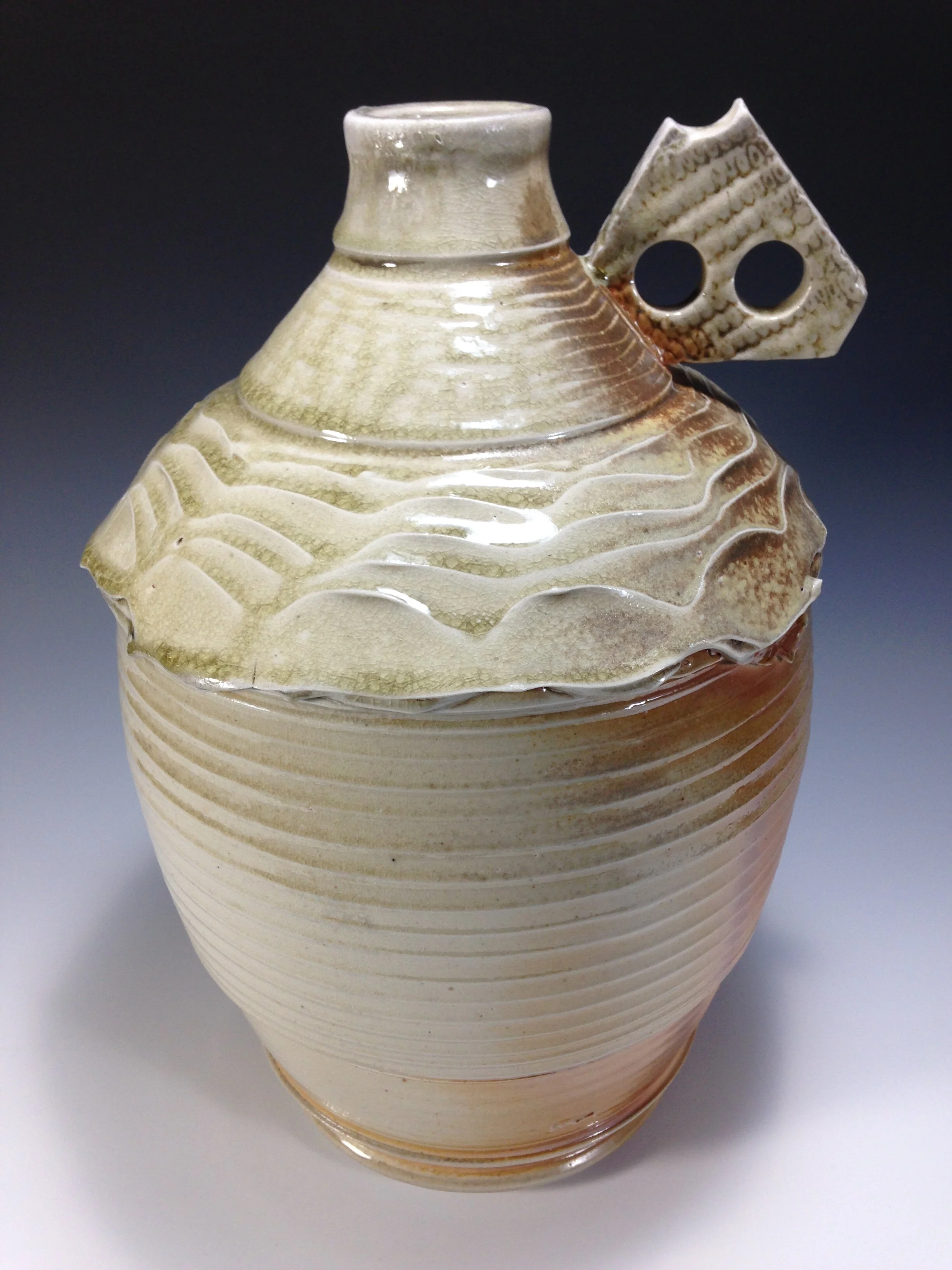 The jugs herein are all functional, fired to about 2350 degrees Fahrenheit. Because of the firing techniques and processes of fabrication, there may be some sharp edges or areas that are not entirely smooth.